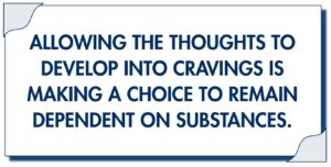 Snapping. Wear a rubberband loosely on your wrist. Each time you become aware of thoughts of using, snap the rubberband and say “No!” to the thoughts as you make your self think about another subject. Have a subject ready that is meaningful and interesting to you.