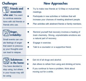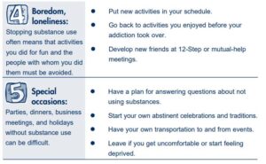 Everyone who attempts to stop using substances runs into situations that make it difficult to maintain abstinence. Listed below are five of the most common situations that are encountered during the first few weeks of treatment. Next to these problems are some suggested alternatives for handling these situations.